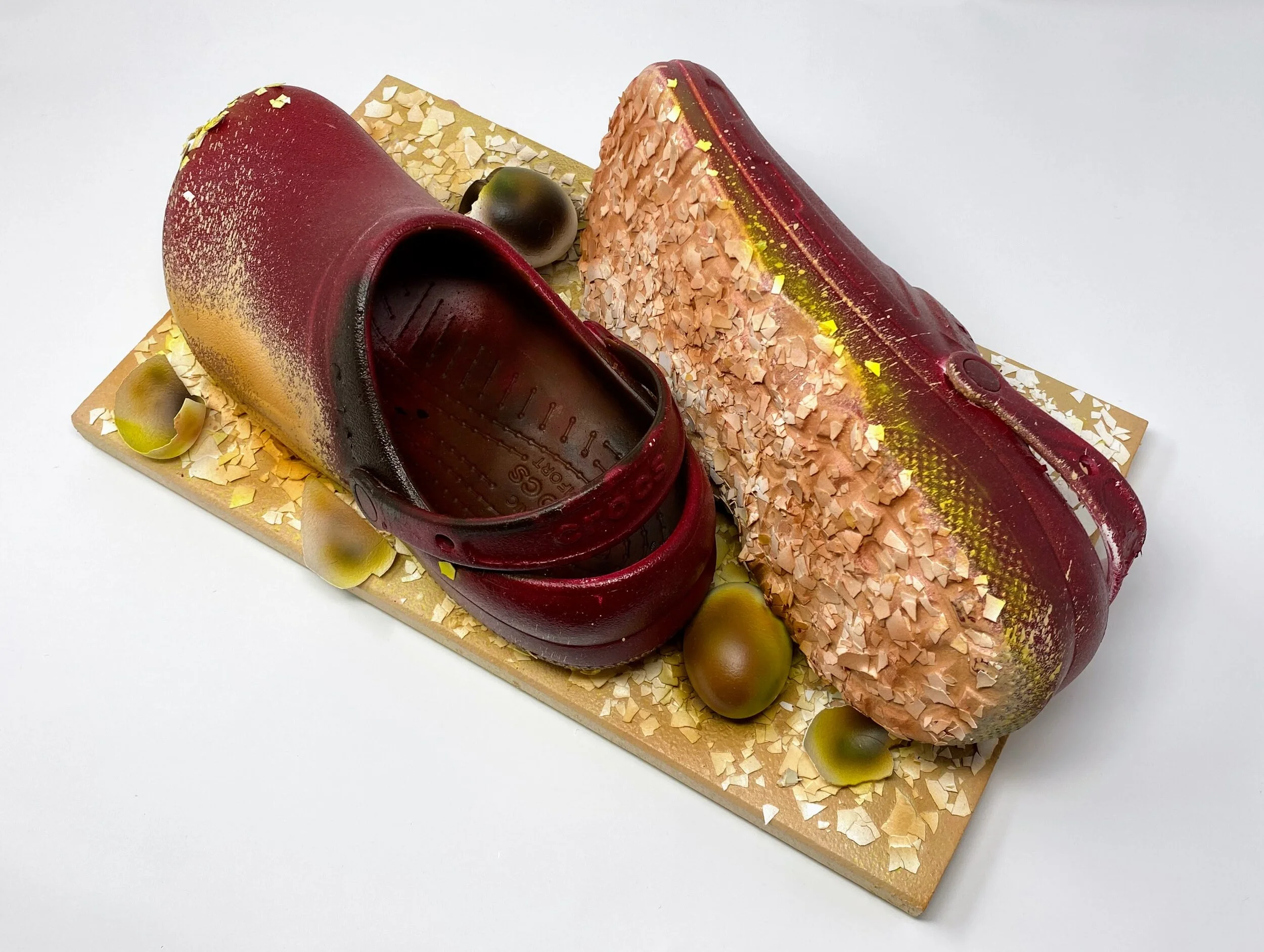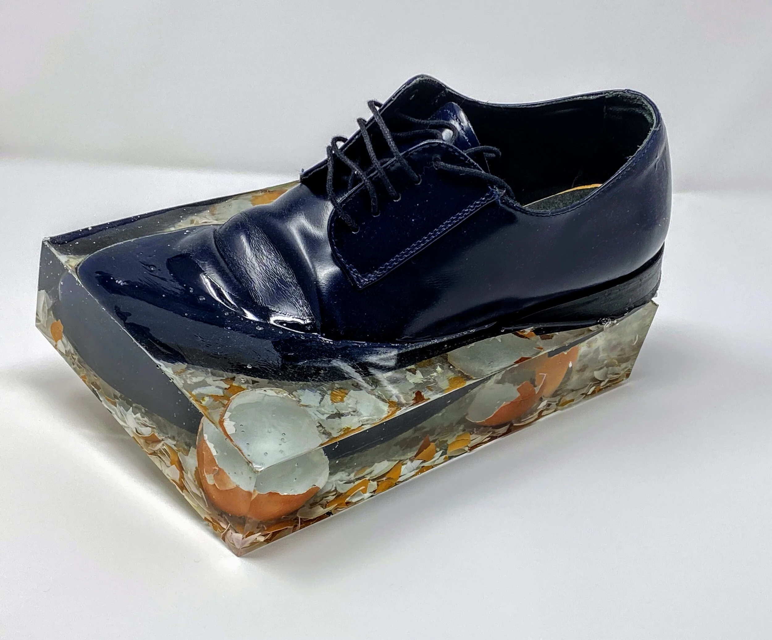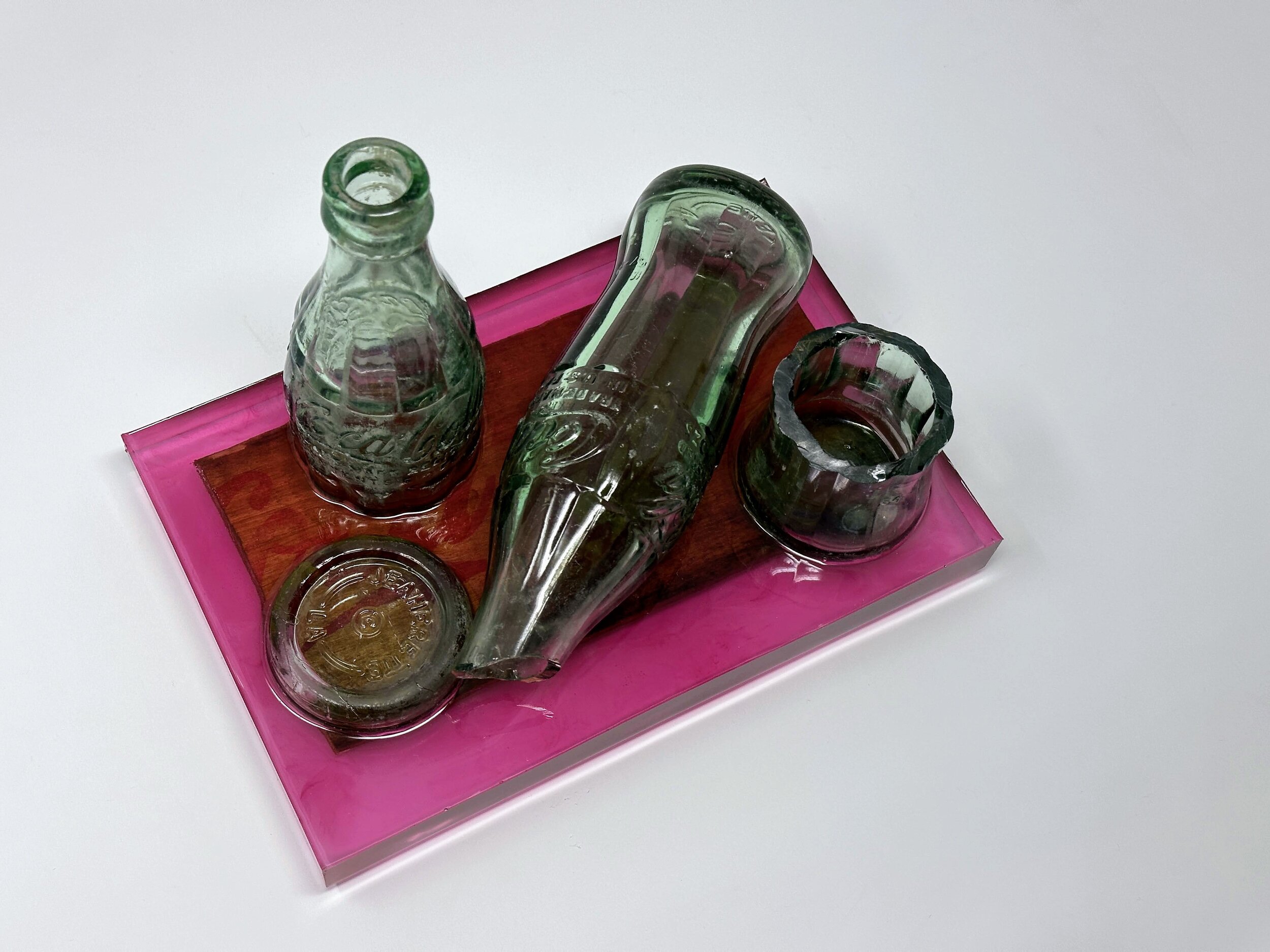 Coke Break. Vintage 1950s bottles destroyed by the artist and mounted on wood in a resin base.