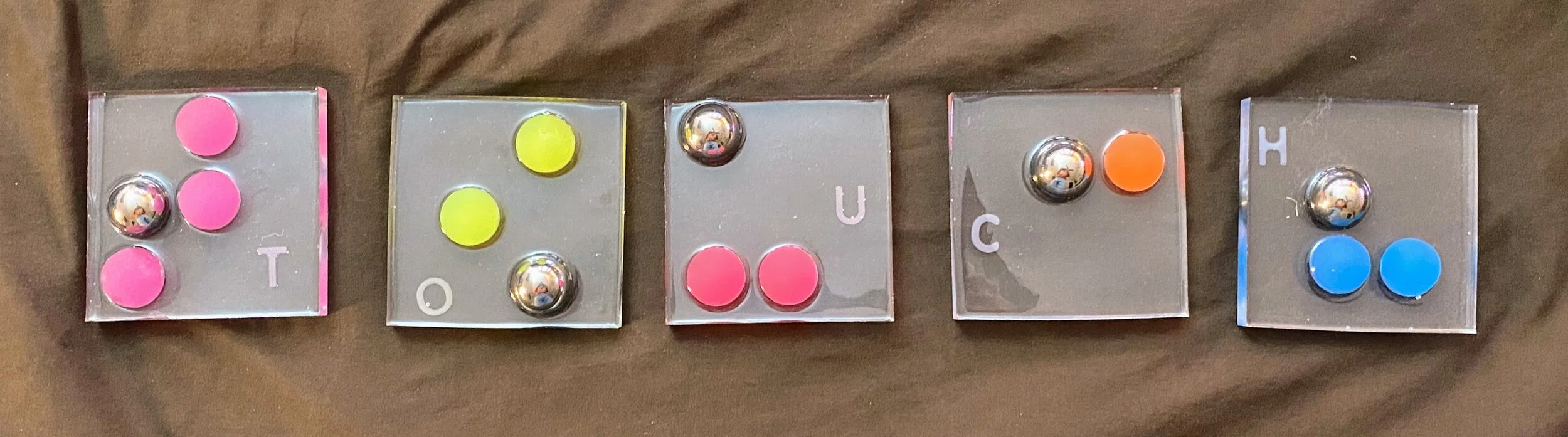A series of five 4” X 4” resin squares. Each, with its raised steel or rubber ball configuration, forms the five letters T O U C H in Braille: A piece welcoming (and messaging) the sightless.